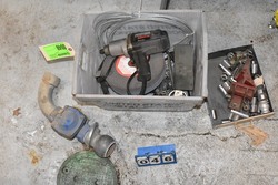 Tote Lot of Assorted Hand Tools Including Sockets, Industrial Impact Wrench, Metal Wire, Etc.