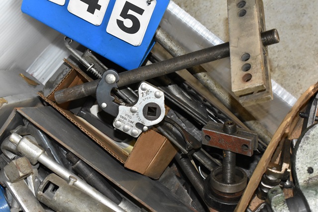 Tote Lot of Assorted Automotive Tools Consisting of Torque Wrench, Assorted Hand Tools, Pullers, Etc.