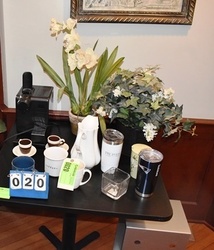 Table Lot of Coffee Cups, Pitcher, Espresso Unit, and Fake Plants