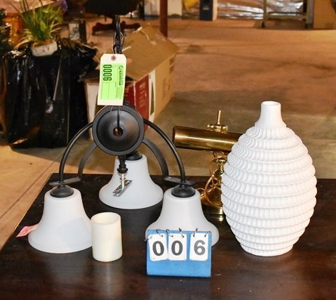 Table Contents: Hanging Lamp, Desk Lamp, and Flower Vase