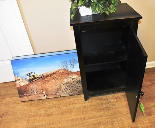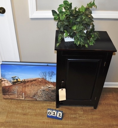 Wooden Cabinet, 30" H, 2 Pieces of Wall Art, and Plant
