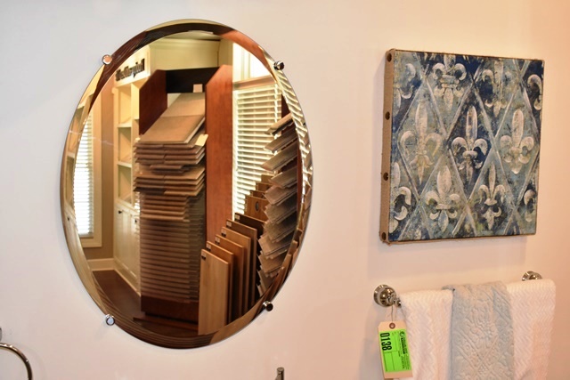 Display Bathroom Setup Including Toilet, Kohler Pedestal Sink, Delta Faucet, Artwork, Mirror (Contents on Top of Toilet Not Included)