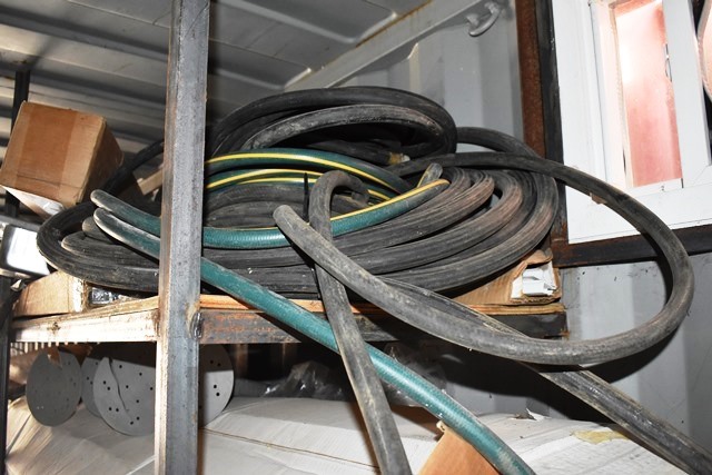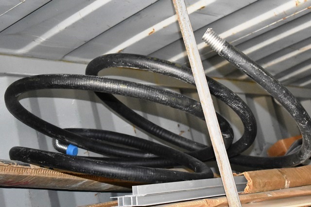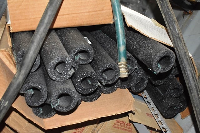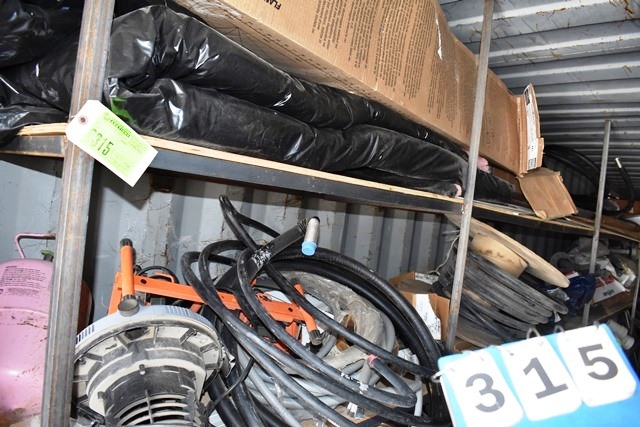 Large Shelf Lot Including Gas Line, Pipe Insulators, Plastic Sheeting, Hoses, Ceiling Suspension System Hardware, Etc.
