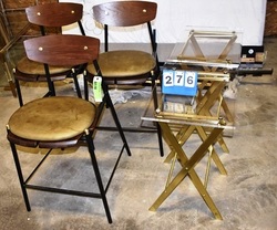 Lot of 2 Acrylic and Gold Folding Tables, 3 Oak/Steel Bar Height Stools with Leather Seat