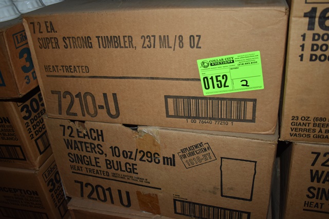 Lot consisting of 1 case Anchor Hocking 8 oz Super Strong Tumbler (approx 72 per case) and 1 case of 10 oz Waters Single Bulge Glasses