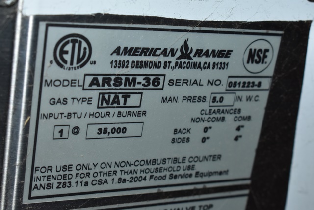 American Range Char Broiler, Model ARSM36, natural gas, 35,000 BTU, 36" wide