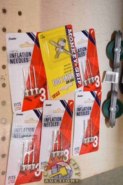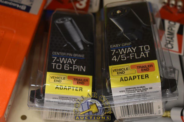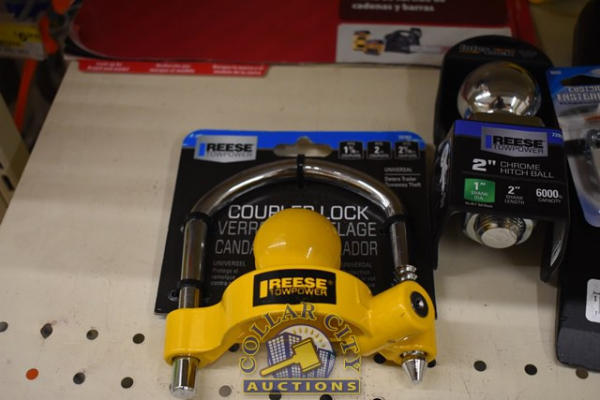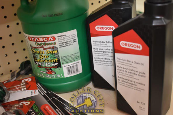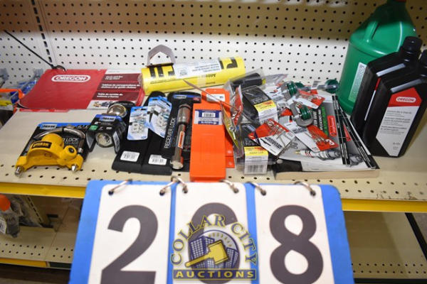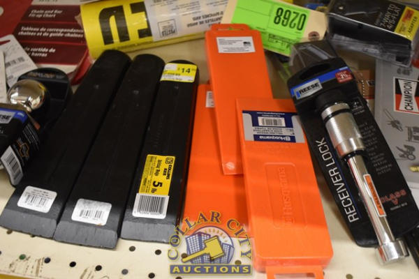 SHELF LOT CONSISTING OF BAR AND CHAIN OIL, VALVE STEM TOOL, REESE COUPLER LOCK, TRAILER BALL, WEDGES, POSTED SIGNED, HUSQVARNA SPLITTING WEDGES
