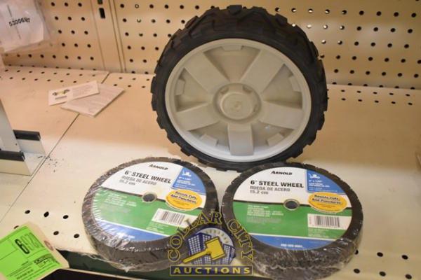 LOT OF LAWN MOWER WHEELS, ASSORTED CHARGERS