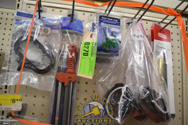 LOT CONSISTING OF HUSQVARNA CHAIN SHARPENER, OREGON DEPTH GAUGE AND FLAT FILE, GAS CAPS, HOSE CLAMPS, ETC.