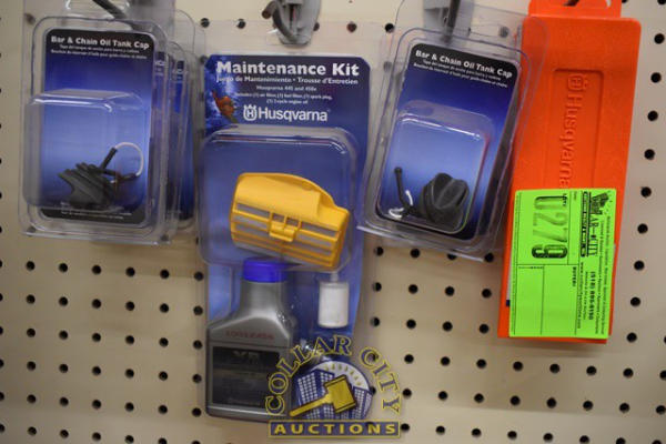 SHELF LOT OF BAR & CHAIN OIL CAPS, FELLING WEDGE, HUSQVARNA MAINTENANCE KIT FOR 445 & 450E