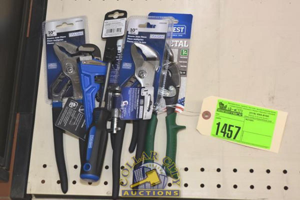 ASSORTED TOOL LOT OF PLIERS AND SMALL PIPE WRENCH