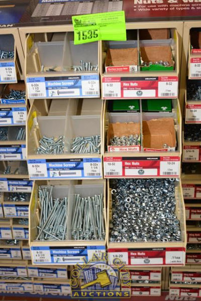 ORGANIZER BIN WITH CONTENTS CONSISTING OF MACHINE SCREWS FROM 6/32" - 1/4" UP TO 4" LONG AND HEX NUTS FROM 6/32" - 3/4"