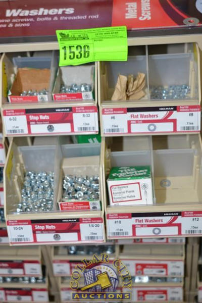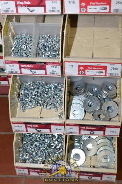 ORGANIZER BIN WITH CONTENTS CONSISTING OF STOP NUTS, FLAT WASHERS, WING NUTS