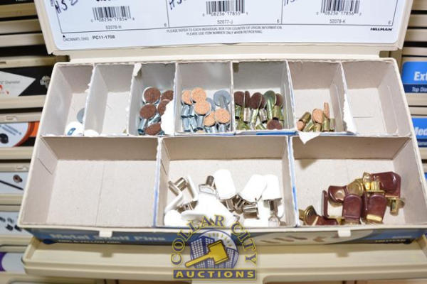 ORGANIZER BIN WITH CONTENTS CONSISTING OF DRAIN PLUGS AND PLASTIC SHELF PINS