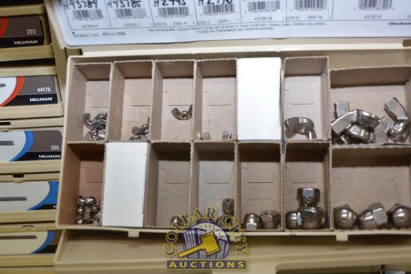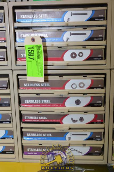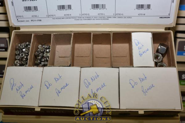 ORGANIZER BIN WITH STAINLESS STEEL MACHINE SCREWS, FENDER AND FINISH WASHERS, HEX BOLTS