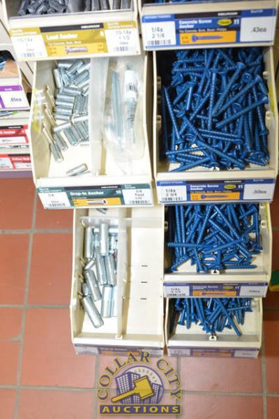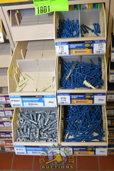 ORGANIZER BIN WITH CONTENTS CONSISTING OF WALL BOARD ANCHORS, CONCRETE SCREW ANCHORS