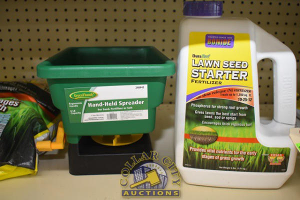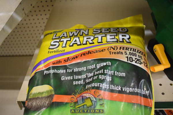 LOT CONSISTING OF BONIDE LAWN SEED STARTER FERTILIZER, HAND HELD SPREADER AND BAG OF BONIDE LAWN SEED STARTER FERTILIZER WITH SLOW RELEASE FERTILIZER, 10-25-12