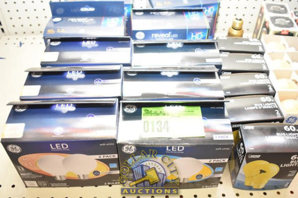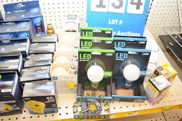 SHELF LOT OF ASSORTED LED AND REGULAR BUG LIGHT LIGHT BULBS