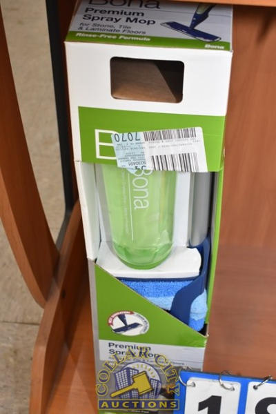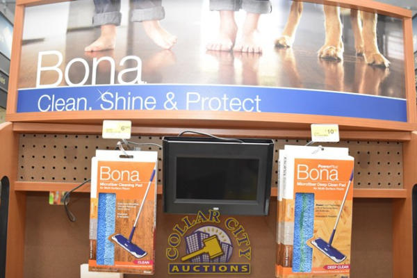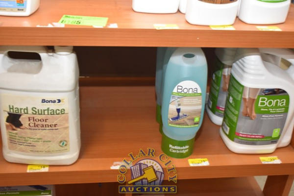 BONA DISPLAY RACK WITH CONTENTS CONSISTING OF PREMIUM SPRAY MOP, FLOOR CLEANERS, AND DISPLAY SCREEN