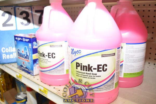 LOT OF PINK EC SOAP, APPROX. 6 GALS. AND FINISH POWER BOWL DISHWASHER TABLETS