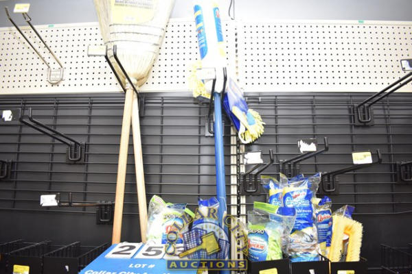 LARGE LOT CONSISTING OF MOP HEADS, MOPS, BROOMS