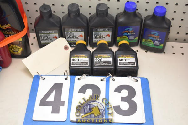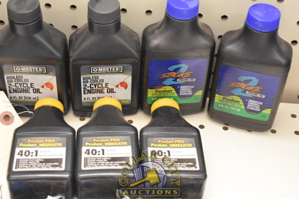 LOT OF ASSORTED SIZED CONTAINERS FROM 3 OZ. - 8 OZ. 2-CYCLE ENGINE OIL