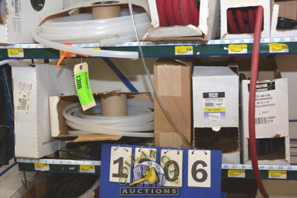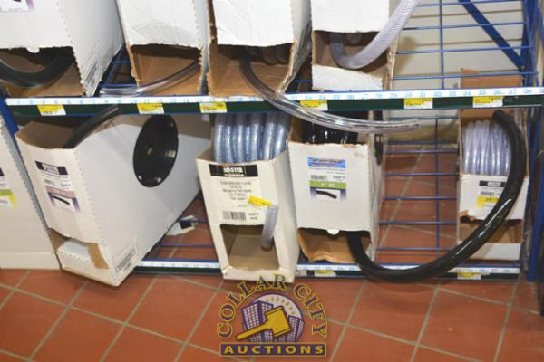 HOSE RACK WITH CONTENTS OF ASSORTED HOSE FROM PVC APPLIANCE DRAIN HOSE 7/8", SUPREME AIR HOSE 3/8", WINDSHIELD WASHER VACUUM HOSE, CLEAR VINYL TUBING