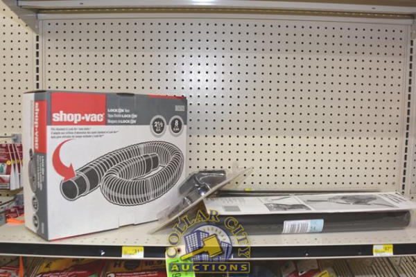 SHELF LOT OF SHOPVAC PARTS CONSISTING OF 2 1/2" HOSE, VAC HEAD, VACUUM CLEANER EXTENSION WANDS