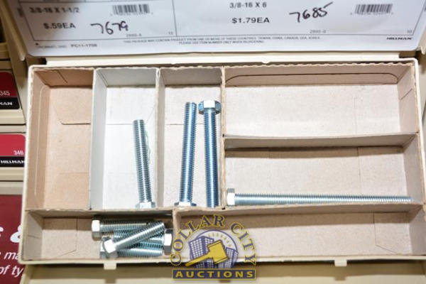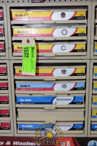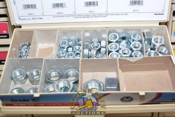 ORGANIZER BIN WITH CONTENTS CONSISTING OF GRADE 8 LOCK NUTS, ARCTIC FLAT WASHERS, LOCK WASHERS, HEX BOLTS