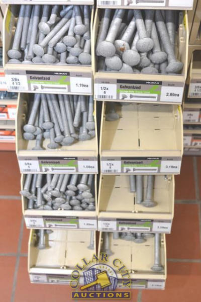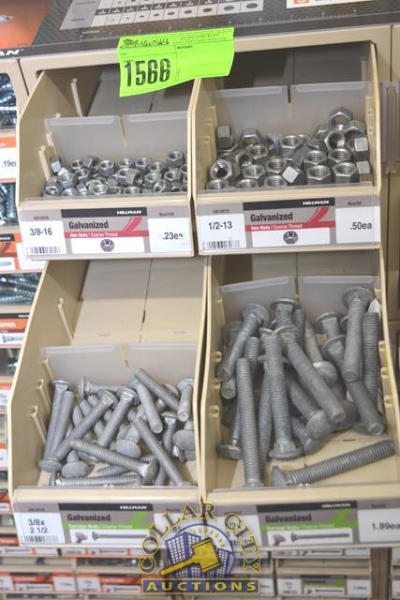 ORGANIZER BINS WITH CONTENTS CONSISTING OF GALVANIZED NUTS AND CARRIAGE BOLTS, 3/8" X 2 1/2" - 1/2" X 12"