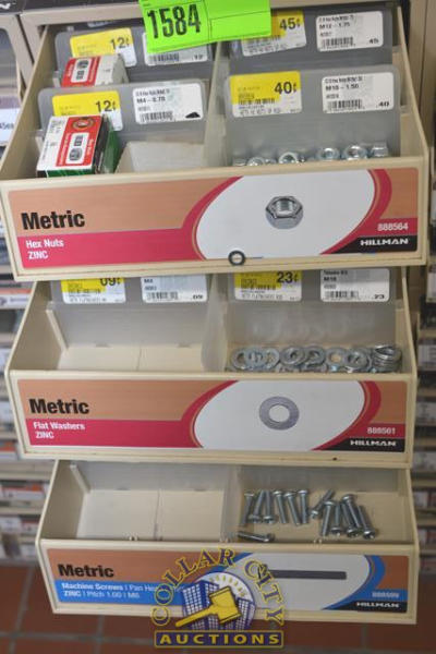 ORGANIZER BIN WITH CONTENTS CONSISTING OF METRIC NUTS, WASHERS, MACHINE SCREWS, BOLTS