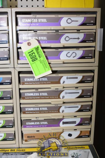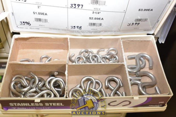 ORGANIZER BIN WITH CONTENTS CONSISTING OF STAINLESS STEEL SCREW EYES, EYE BOLTS, S HOOKS, CAP SCREWS, ETC.