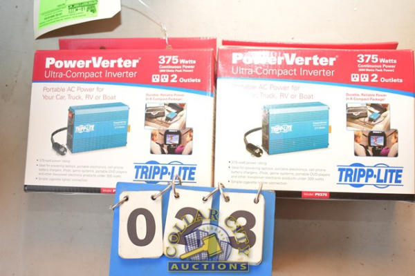 Lot of 2 Powerverter Ultra Compact Inverters, 375 watts continuous power, 600 watts peak power, with 2 outlets (We do not guarantee the working condition or completeness of any of these items.)