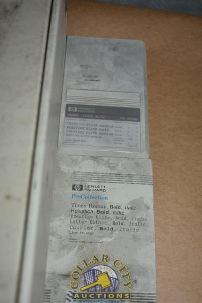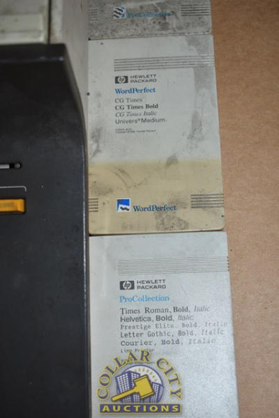 Hewlett Packard Model 10 Calculator and a Hewlett Packard Pro Collection, Hewlett Packard Word Perfect Pro Collection, and Legal Elite Font Cartridge (We do not guarantee the working condition or completeness of any of these items.)