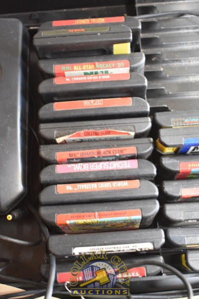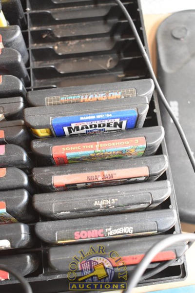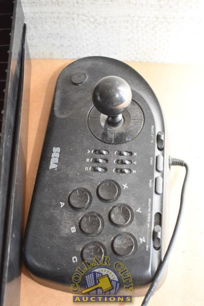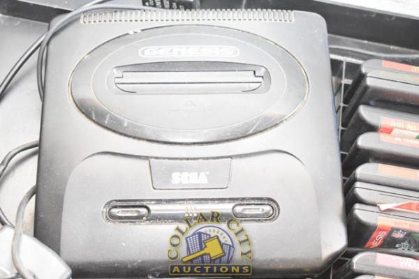 Lot includes a Sega Genesis, Multiple Games, a Sega 6-Button Arcade Stick (We do not guarantee the working condition or completeness of any of these items.)