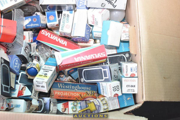 Lot of primarily vintage Projector Lamps including GE, Sylvania, Westinghouse, etc. (We do not guarantee the working condition or completeness of any of these items.)