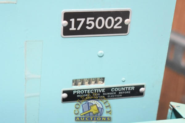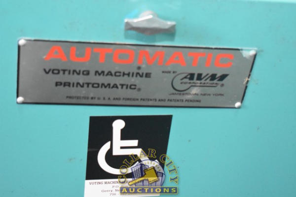 Automatic Voting Machine Print-o-matic, Made by A.V.M Corp. Believed to have last been used in a General Election in November 2009. Lever Machine, No keys present, unable to open. Machine #175002 (CUSTOMER IS RESPONSIBLE FOR REMOVAL. NO HELP WILL BE AVAILABLE.) (We do not guarantee the working condition or completeness of any of these items.)