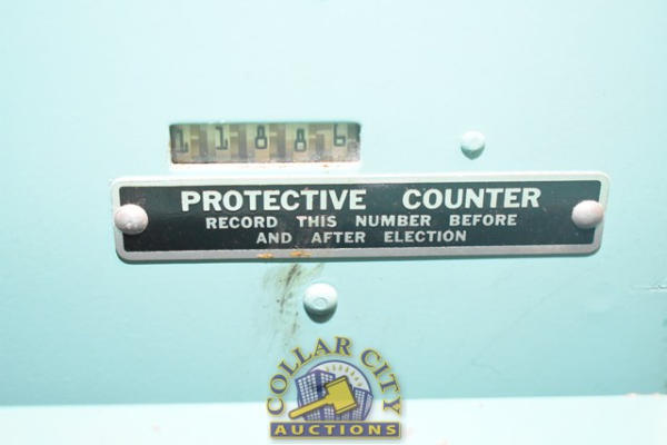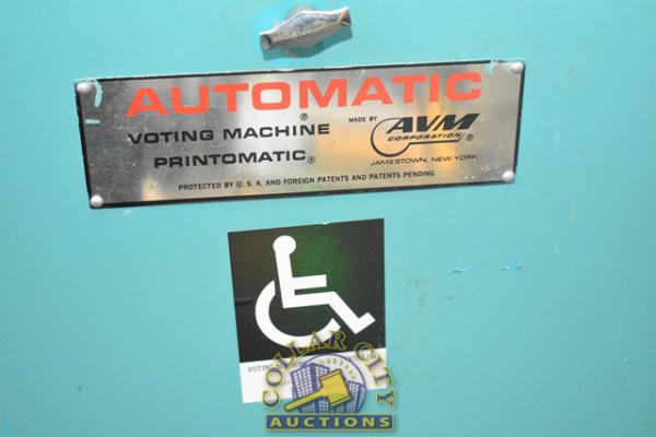 Automatic Voting Machine Print-o-matic, Made by A.V.M Corp. Believed to have last been used in a General Election in November 2009. Lever Machine, No keys present, unable to open. Machine #175003 (CUSTOMER IS RESPONSIBLE FOR REMOVAL. NO HELP WILL BE AVAILABLE.) (We do not guarantee the working condition or completeness of any of these items.)