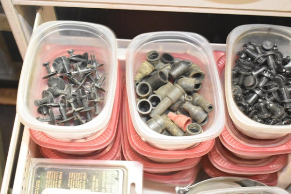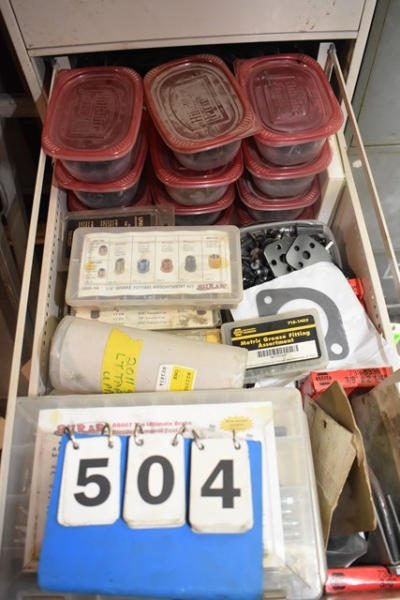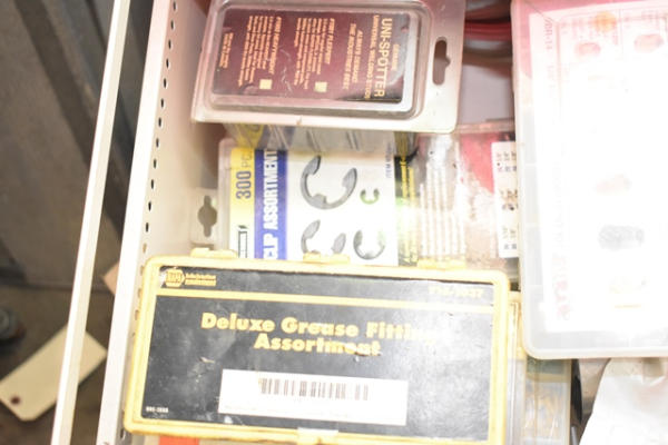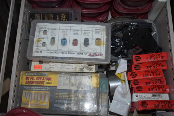 Drawer contents consisting of brake fitting assortment, grease fitting assortment, caps, etc.