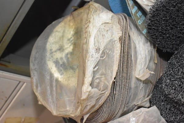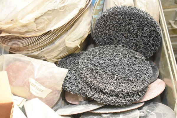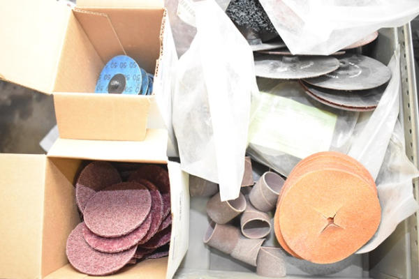Drawer contents consisting of sanding discs, grinding discs, etc.