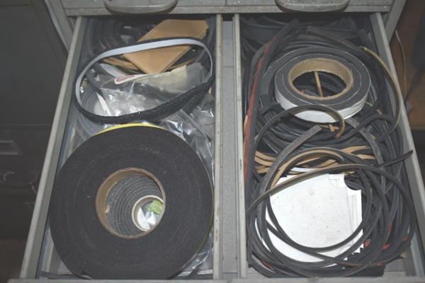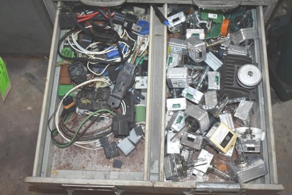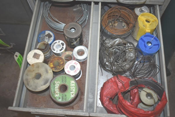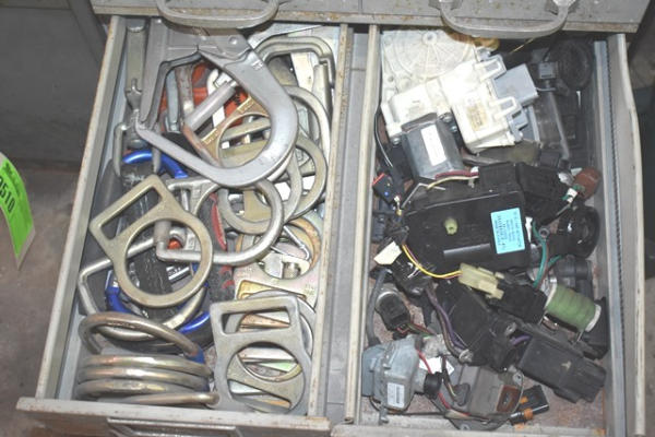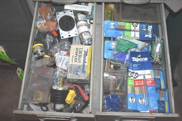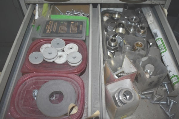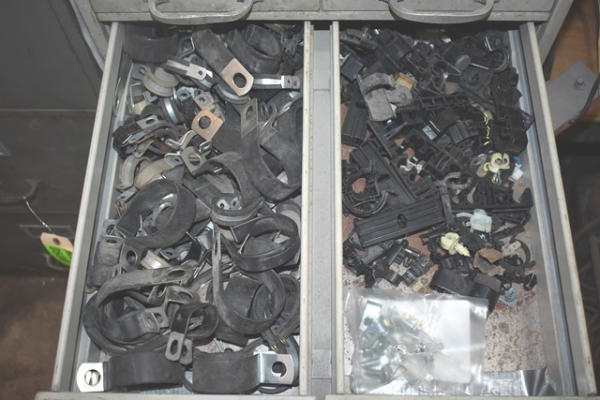 Cabinet with contents consisting of fittings, clips, nuts, bolts, wire loom holder, etc.