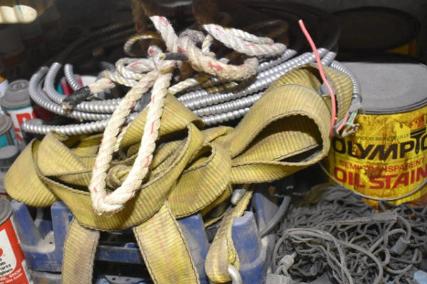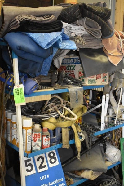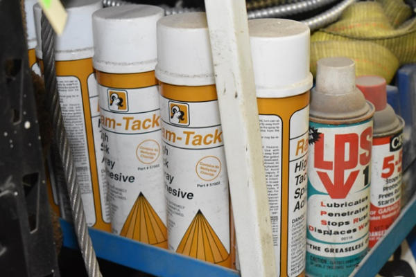 Shelving unit with contents consisting of High Tack Spray, hitch, drawer slides, etc.
