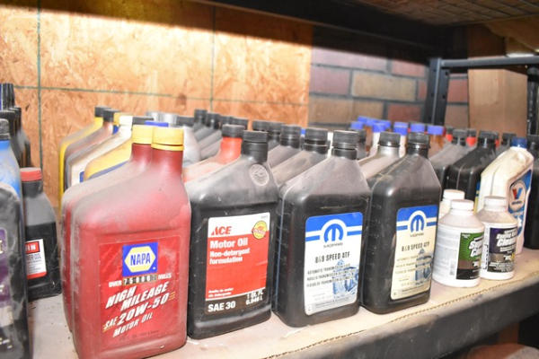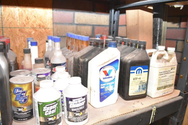 Shelf lot of assorted fluids including oil, gear & axle lubricant, power steering fluid, etc.