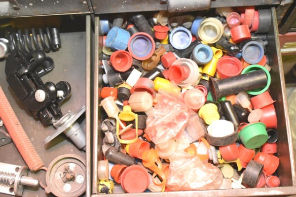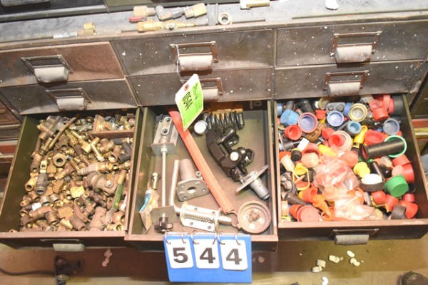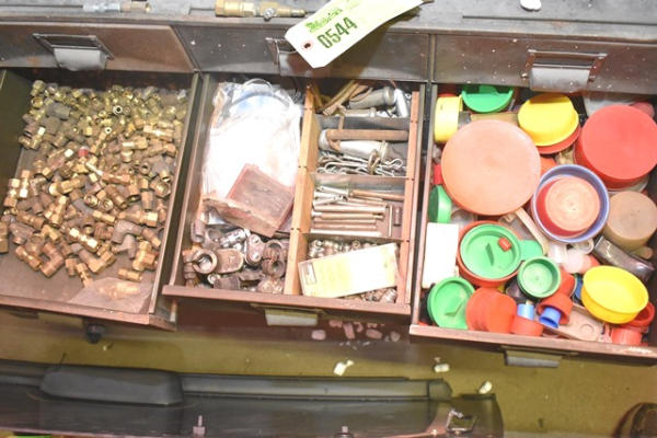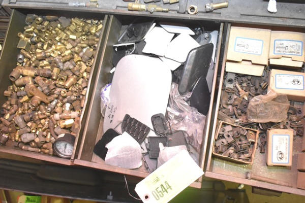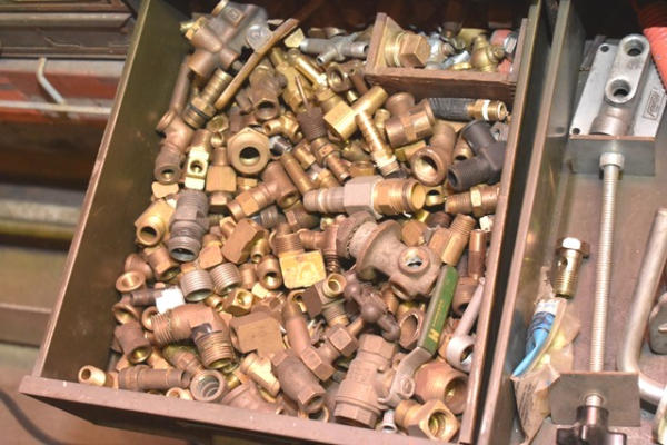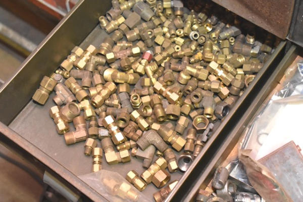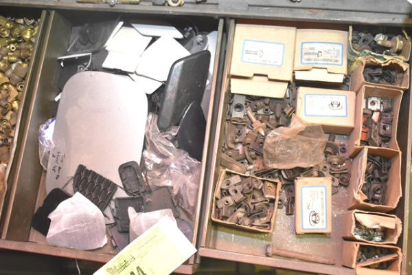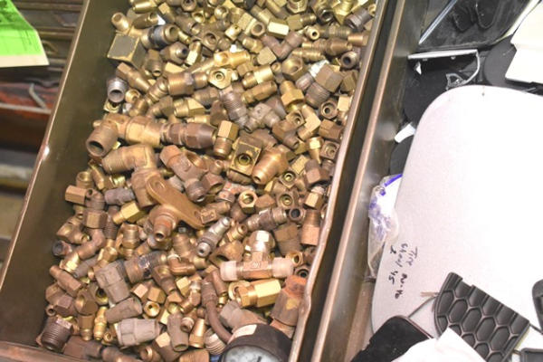Nut and bolt organizer with contents consisting of brass fittings, body clips, etc.