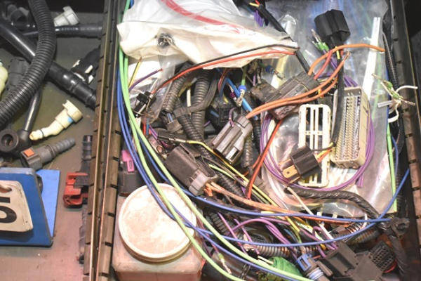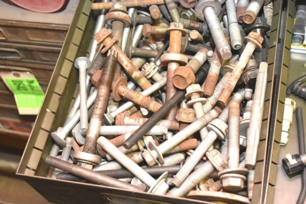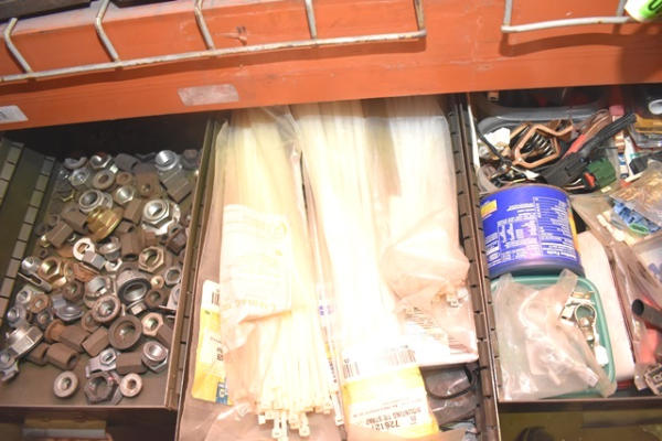 Nut and bolt organizer with assorted electrical supplies, battery terminal, zip ties, spindle nuts