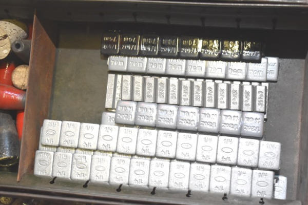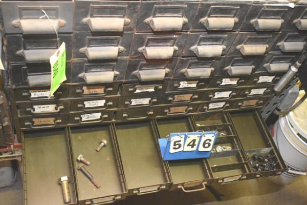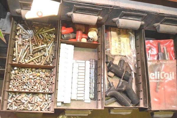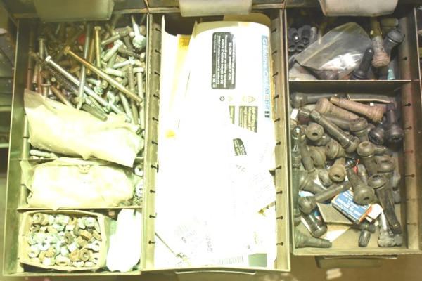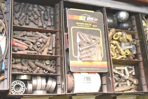 Nut and bolt organizer with contents of studs, bearings, brass fittings