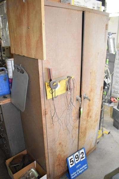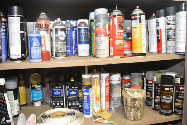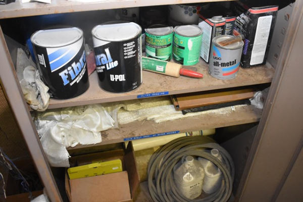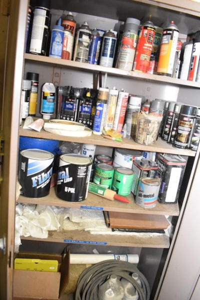 2-door approx. 36" metal cabinet with assorted undercoating spray paint, etc.