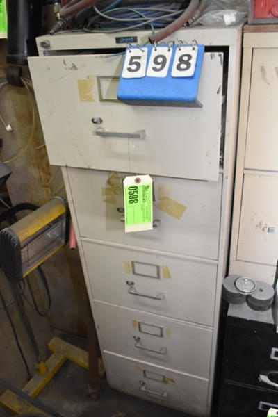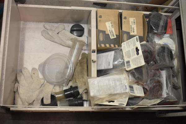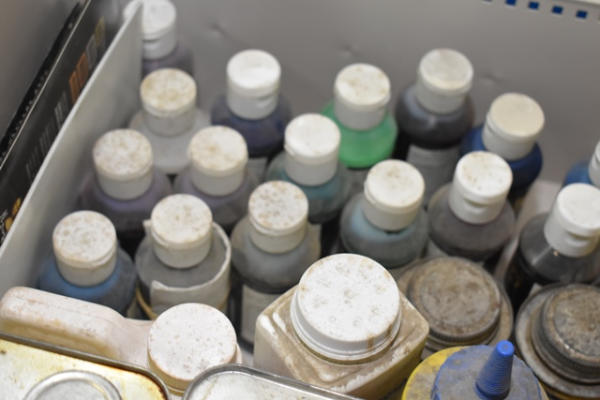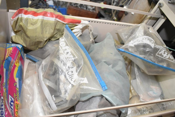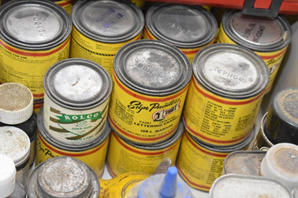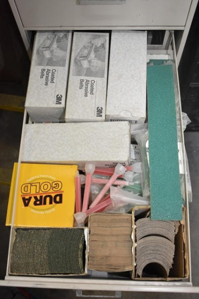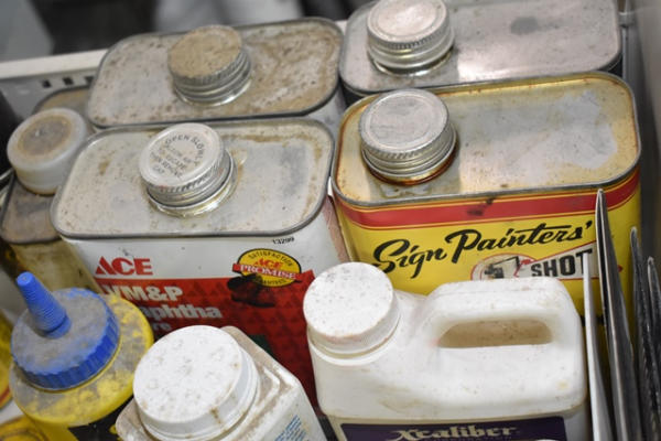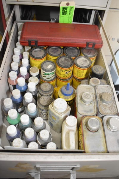 File cabinet with contents consisting of sign paint, baggies, etc.