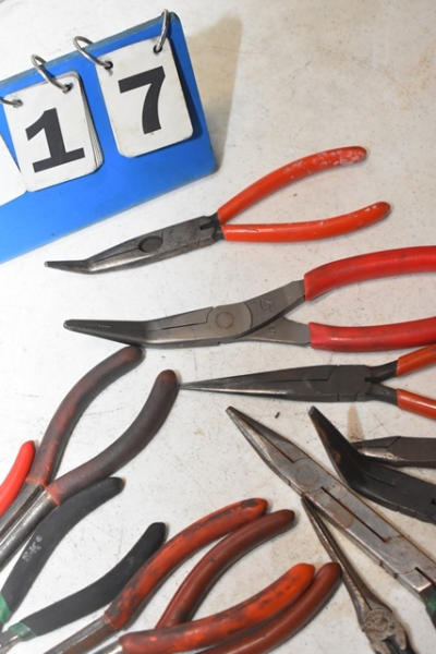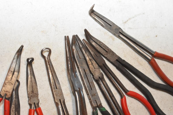 Box lot of specialty needle nose pliers, Snap-On, Timplex, etc.