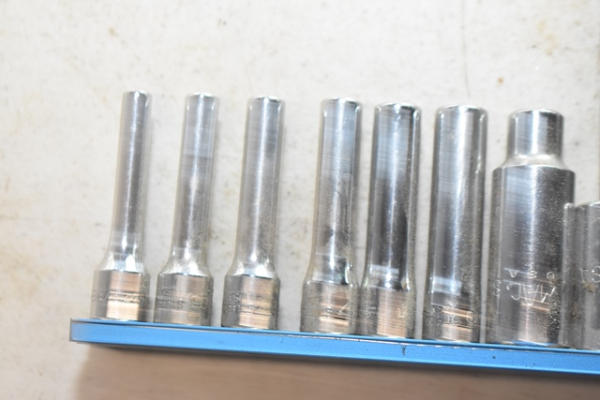Rack of mostly Mac and Matco sockets, 1/4" and 3/8" drive